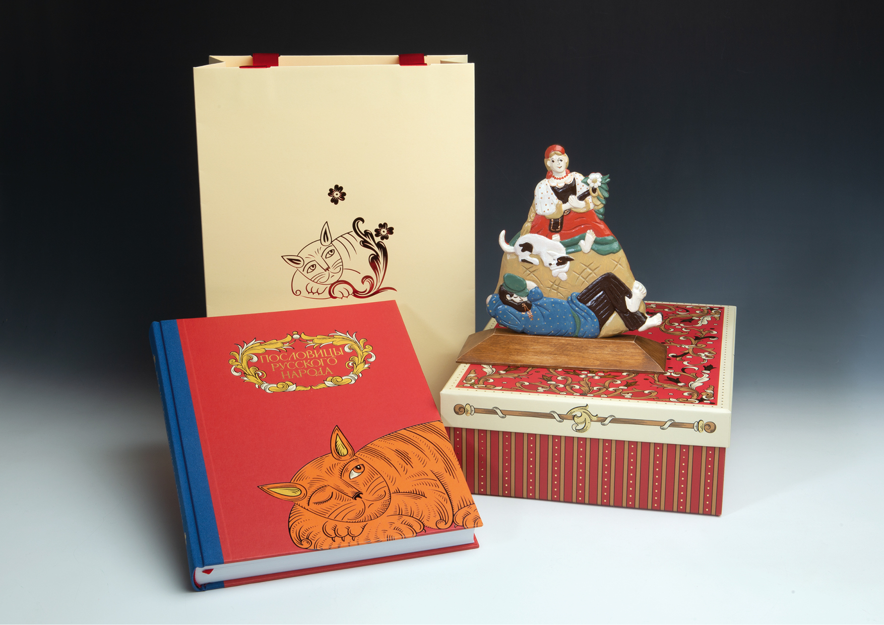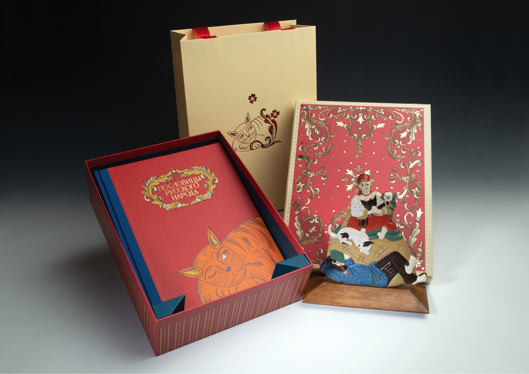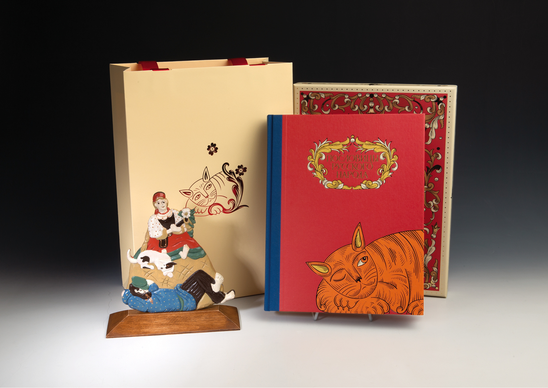 Две иллюстрации из книги легли в основу деревянной скульптуры, дизайн которой придуман Натальей Морозовой по мотивам народной игрушки-перевертыша. Воплотили идею в мастерской художницы Анны Венге. Резное изображение на одной стороне незаметно перетекает в совершенно другое на обороте, сохраняя при этом единый контур. Нарядная и жизнерадостная, скульптура тонкой ручной работы украсит рабочий стол или домашний интерьер.