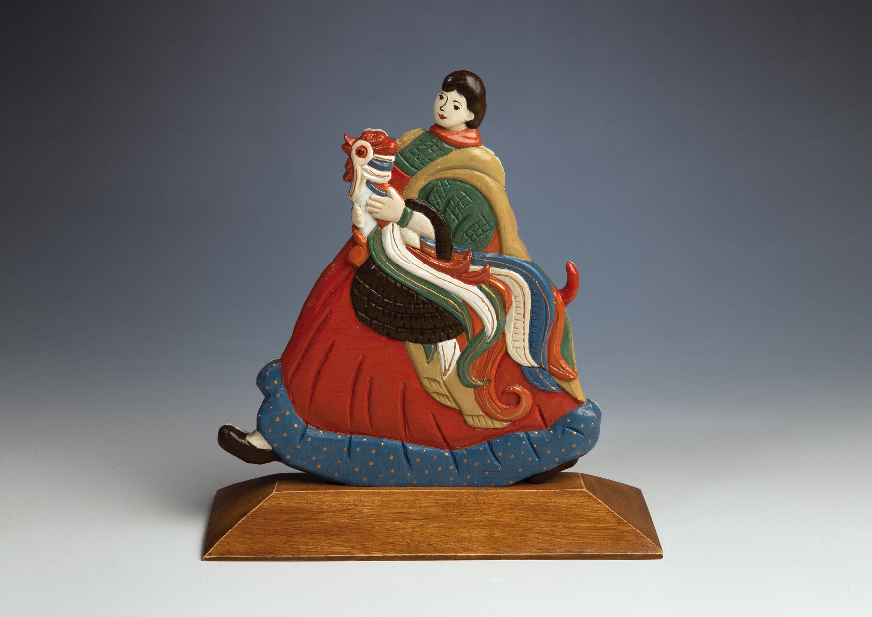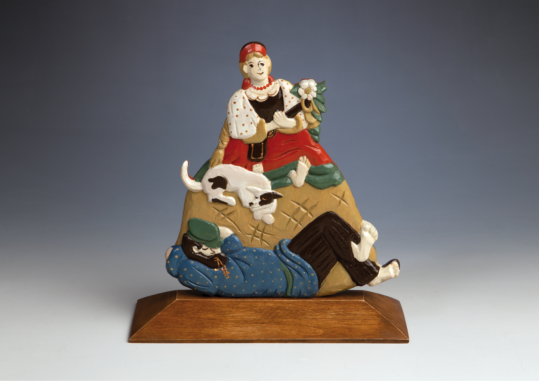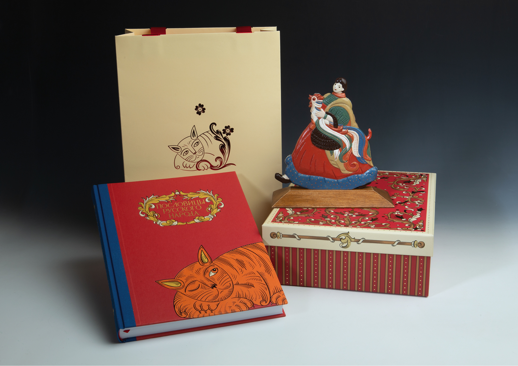 Две иллюстрации из книги легли в основу деревянной скульптуры, дизайн которой придуман Натальей Морозовой по мотивам народной игрушки-перевертыша. Воплотили идею в мастерской художницы Анны Венге. Резное изображение на одной стороне незаметно перетекает в совершенно другое на обороте, сохраняя при этом единый контур. Нарядная и жизнерадостная, скульптура тонкой ручной работы украсит рабочий стол или домашний интерьер.