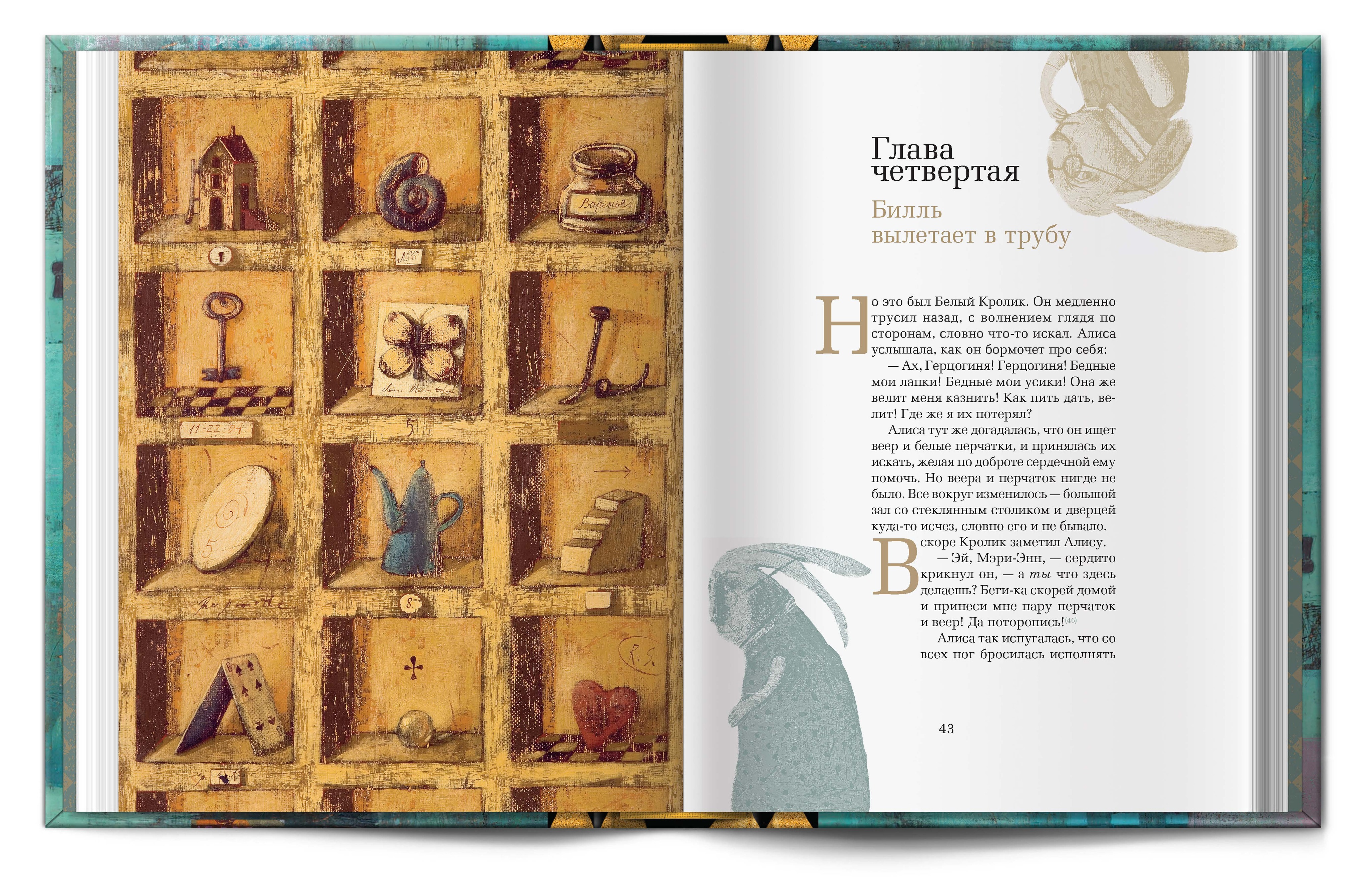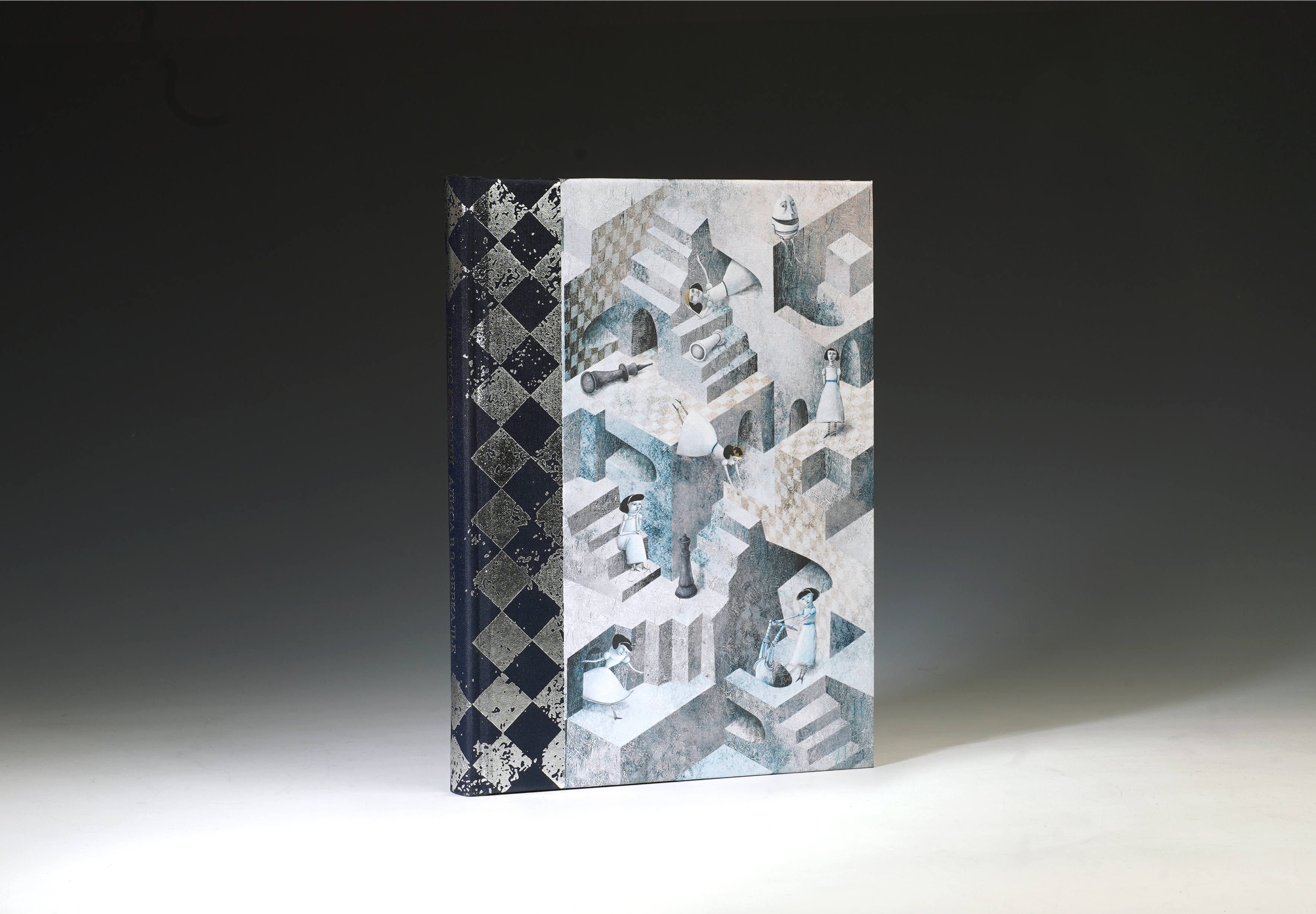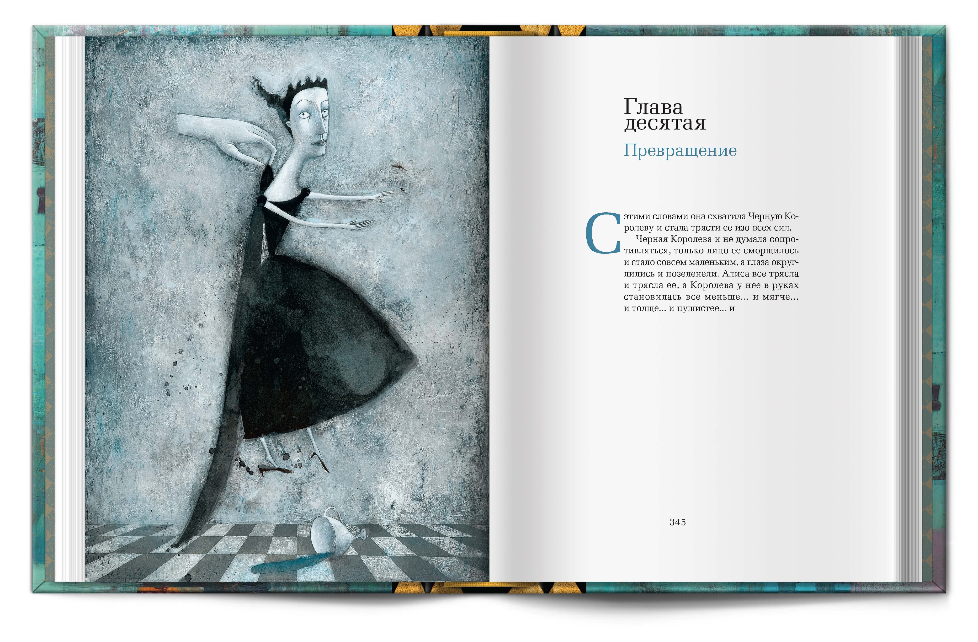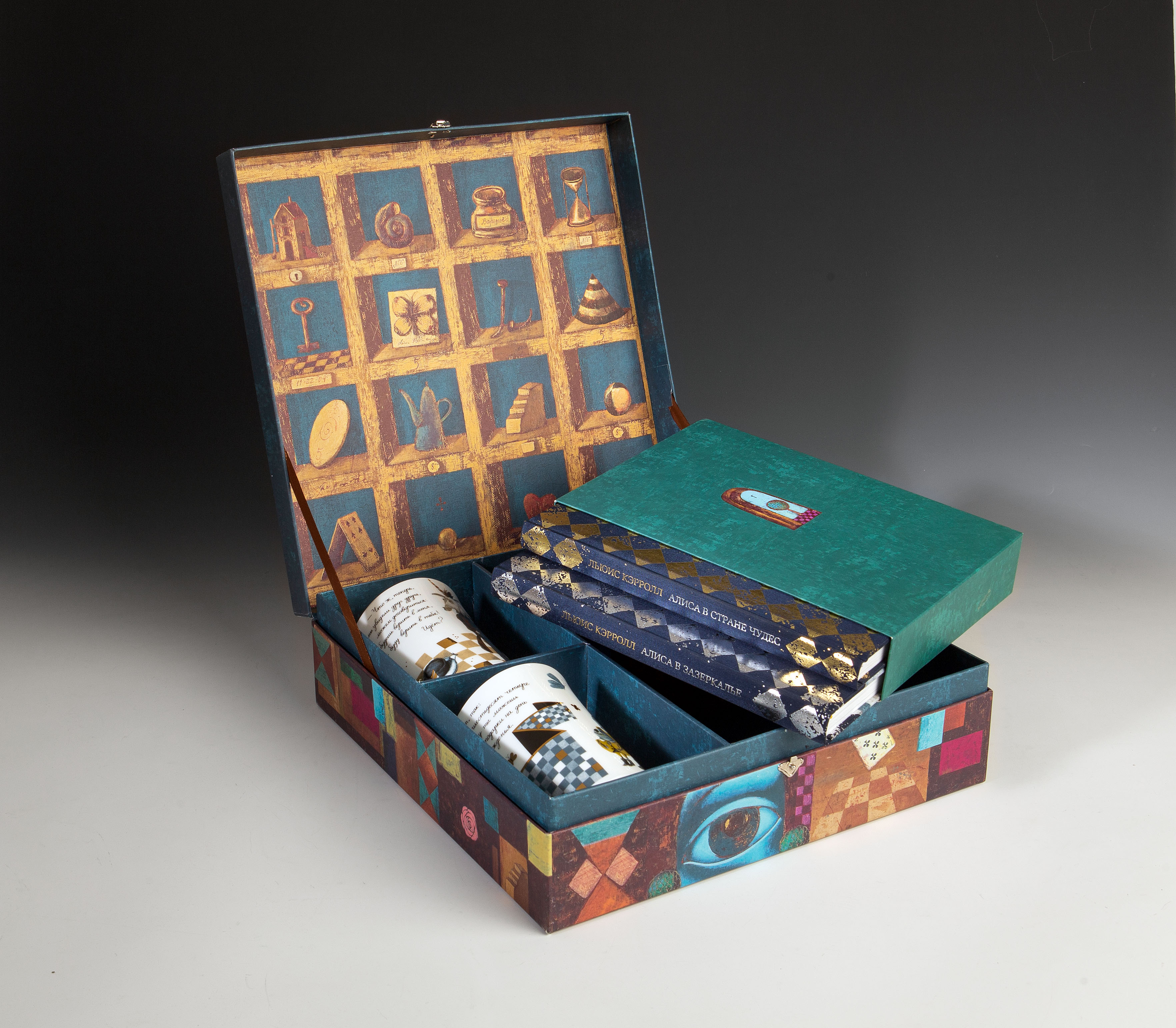 Под шахматной крышкой скрываются два бокала для безумного чаепития, двухтомник Л. Кэролла "Алиса в Стране чудес" и "Алиса в зазеркалье" с завораживающими иллюстрациями Светланы Румак.