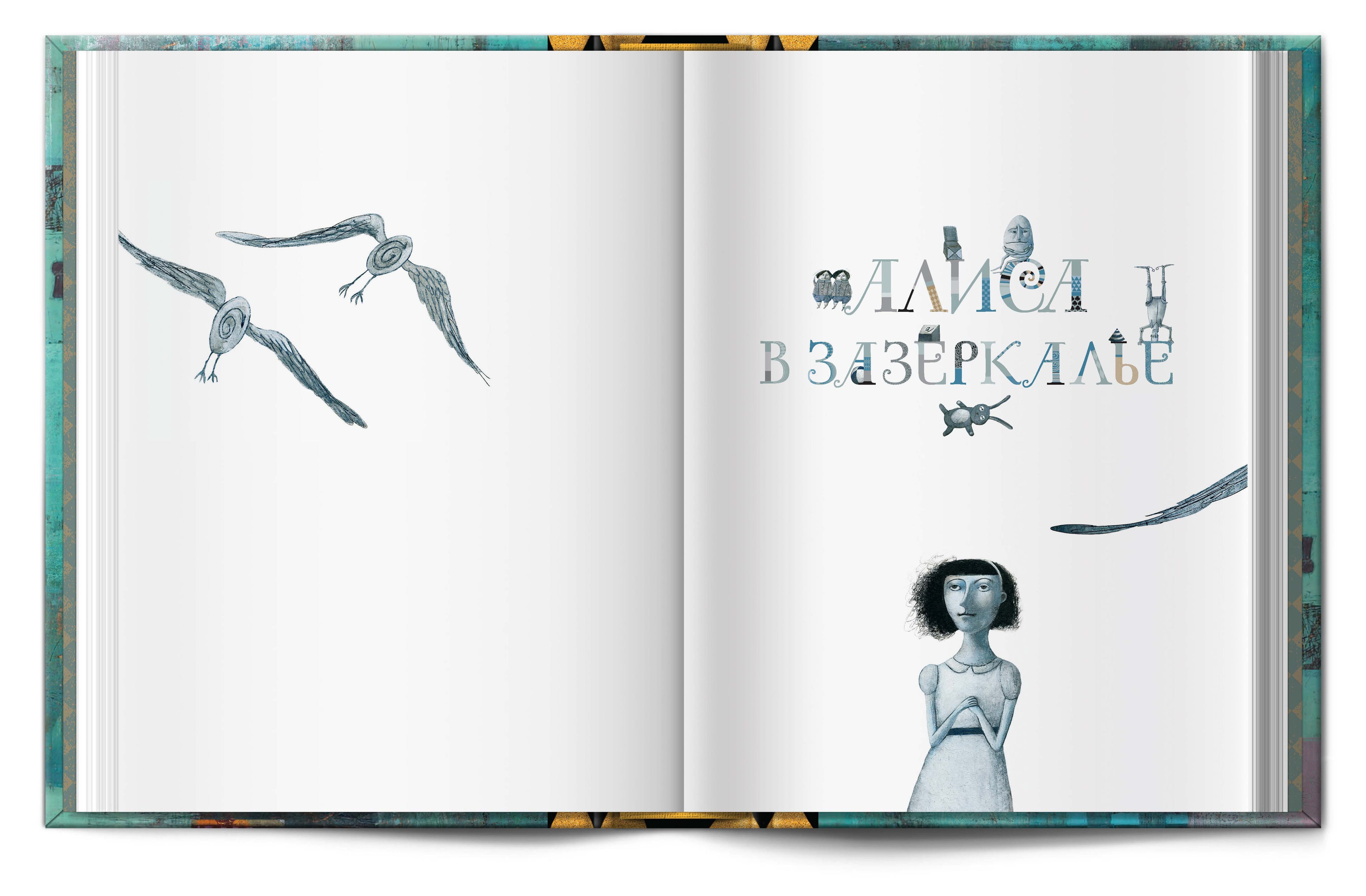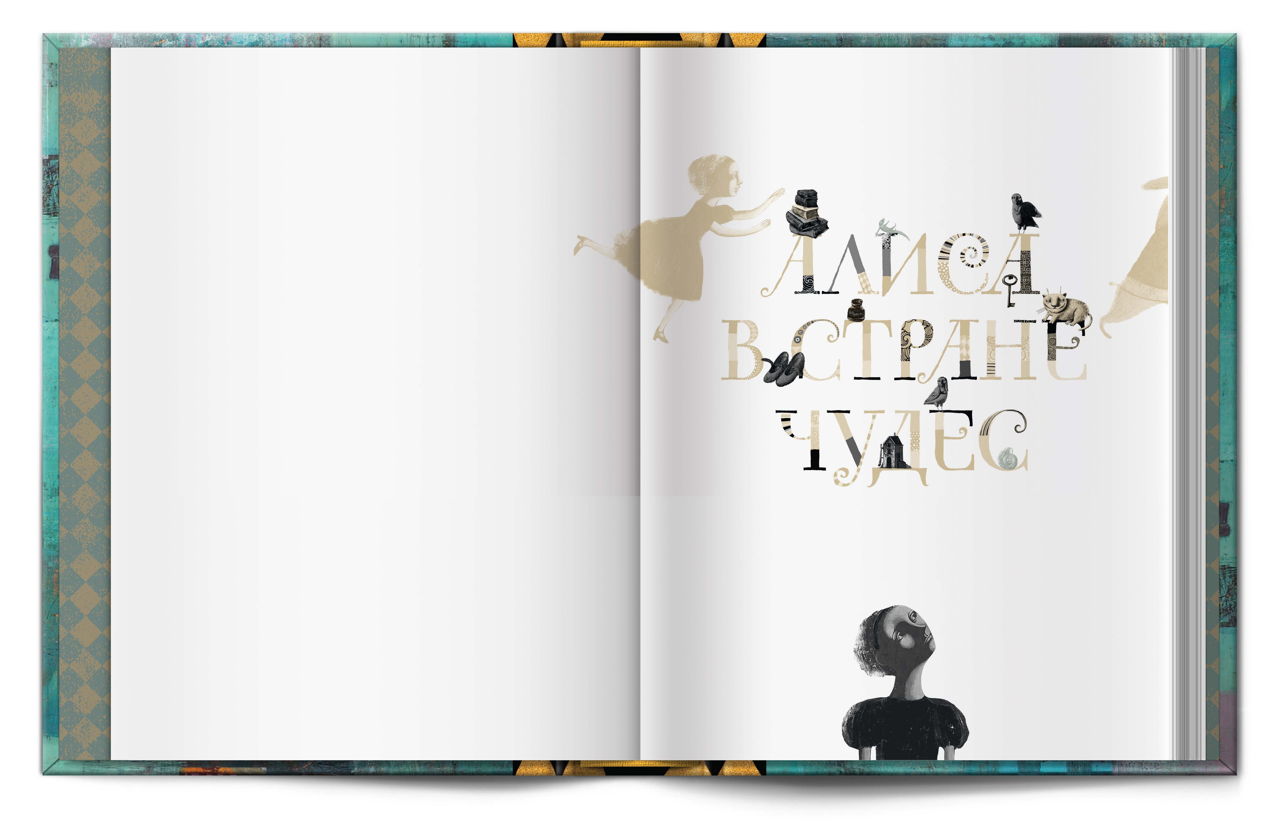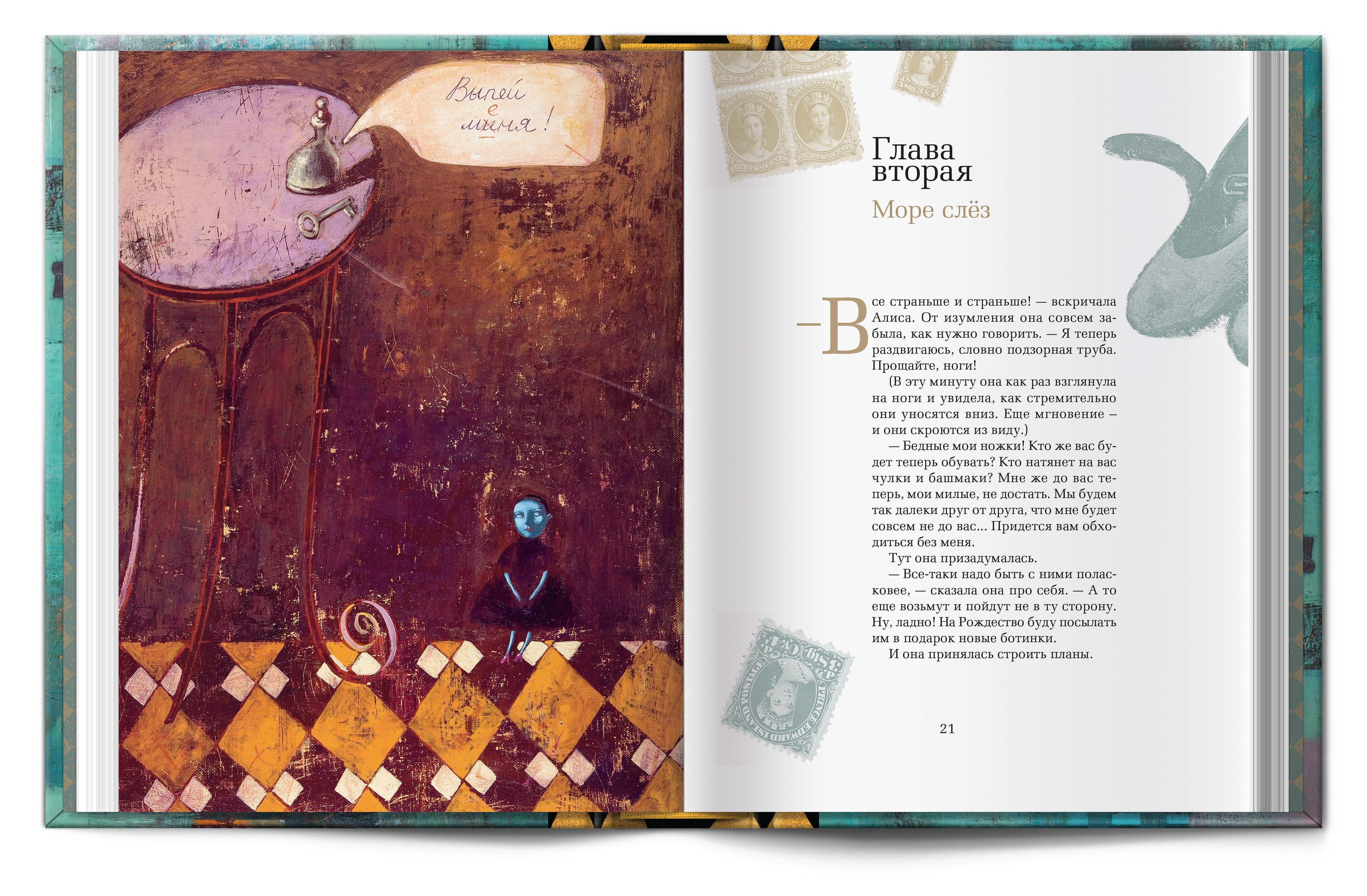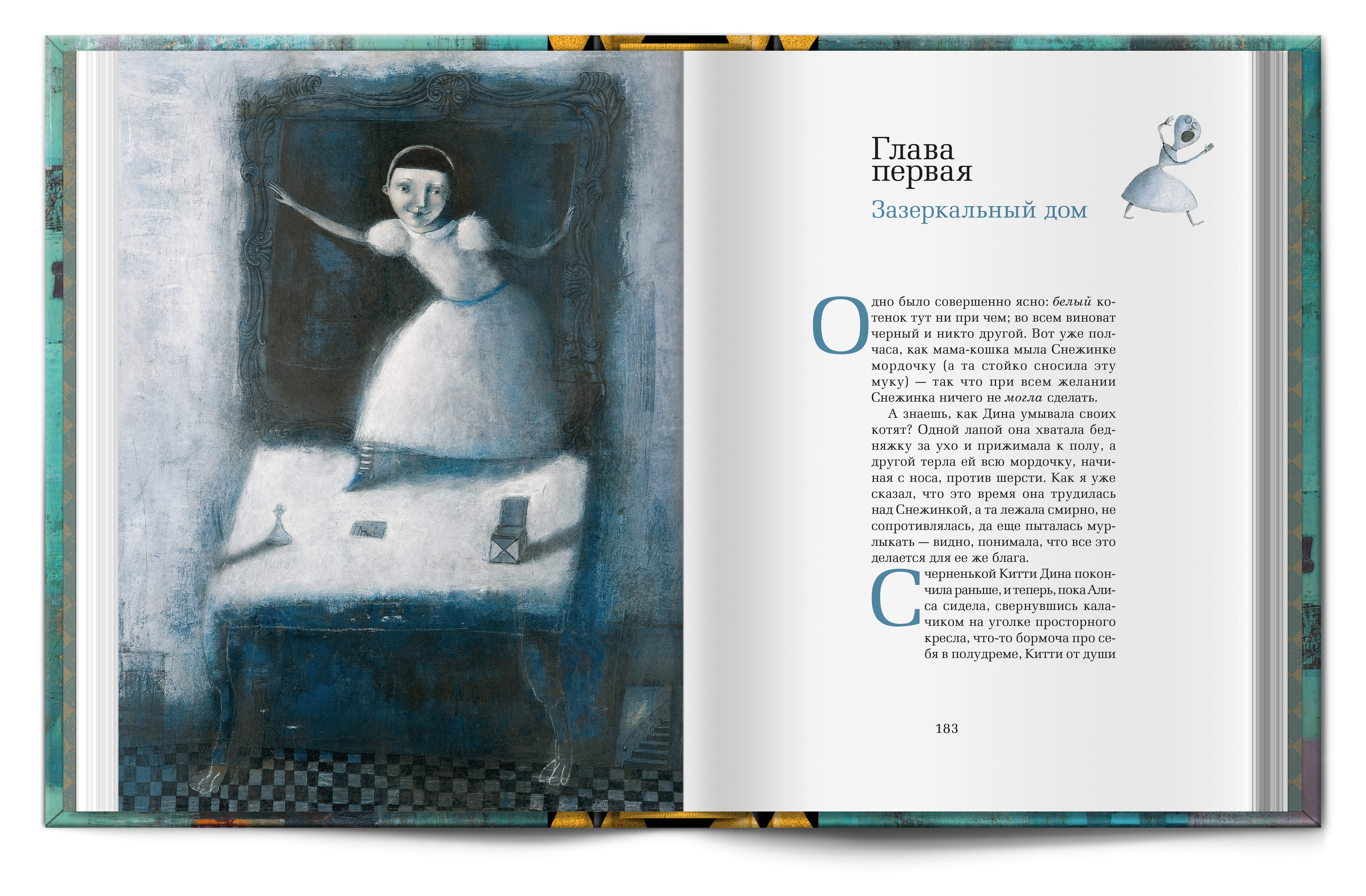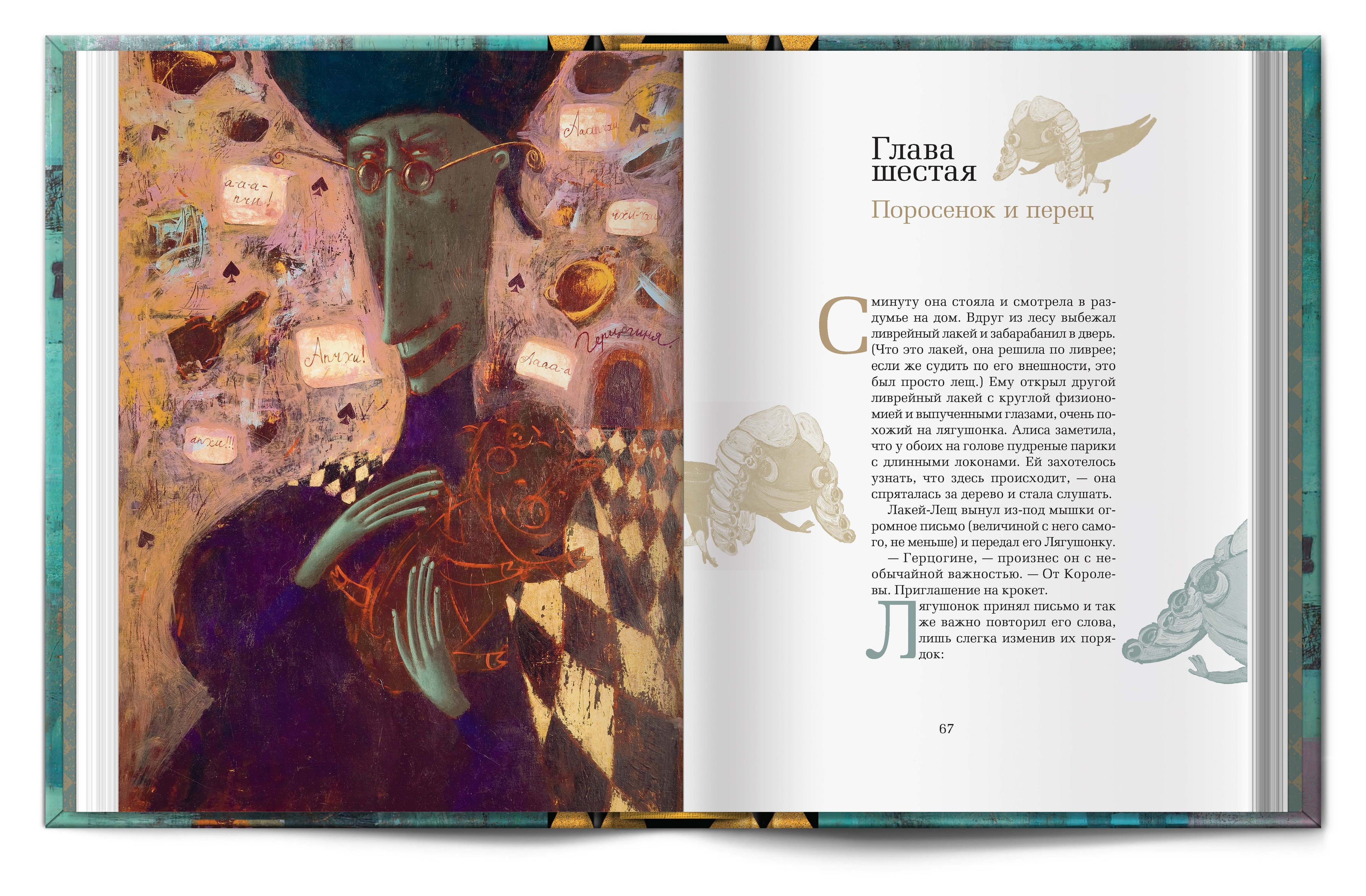 Под шахматной крышкой скрываются два бокала для безумного чаепития, двухтомник Л. Кэролла "Алиса в Стране чудес" и "Алиса в зазеркалье" с завораживающими иллюстрациями Светланы Румак.