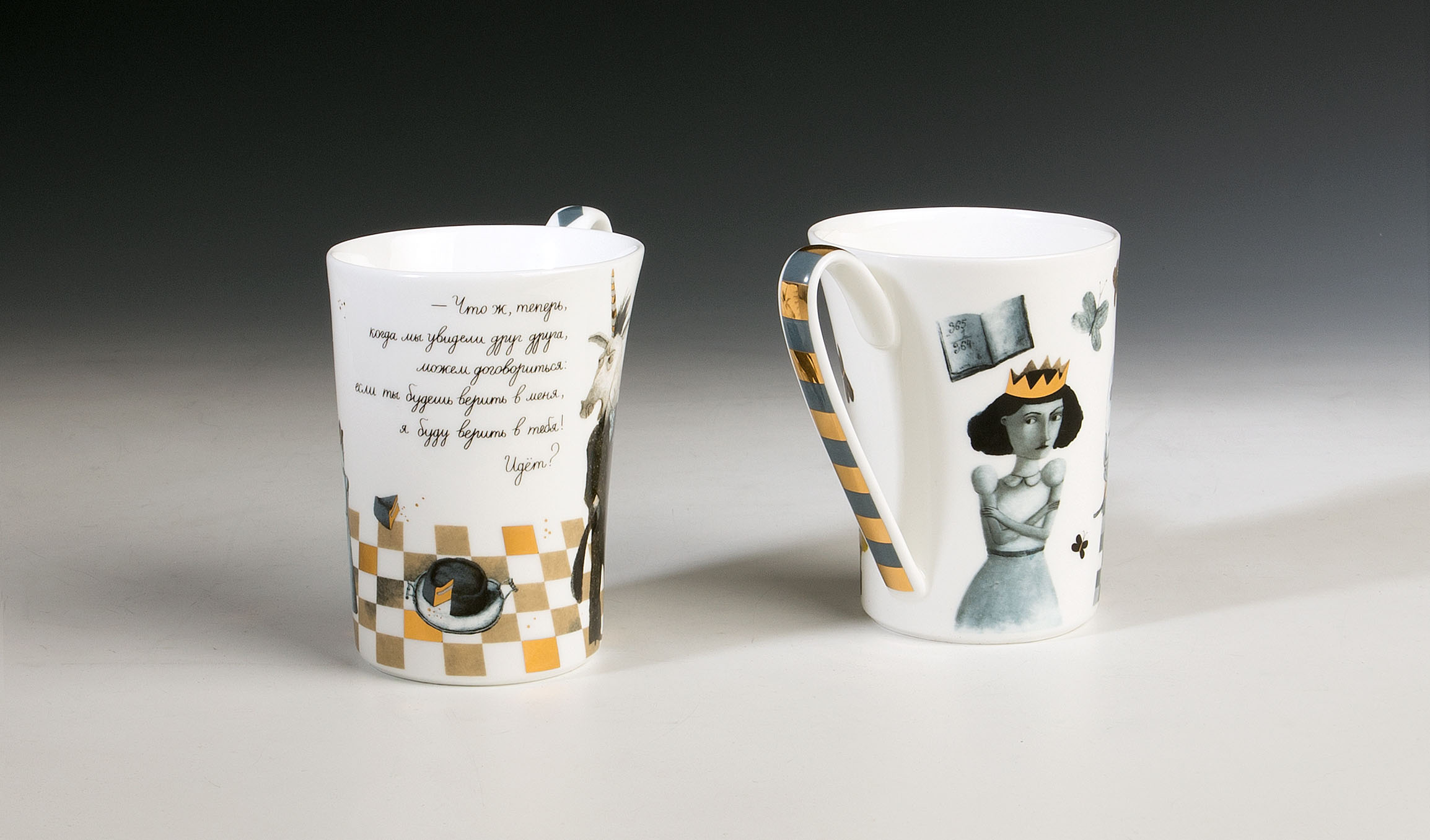 Причудливые бокалы ("День Нерожденья" и "Верить друг в друга") с зазеркальной геометрией, рисунками и цитатами из книг добавят веселого абсурда любому чаепитию!